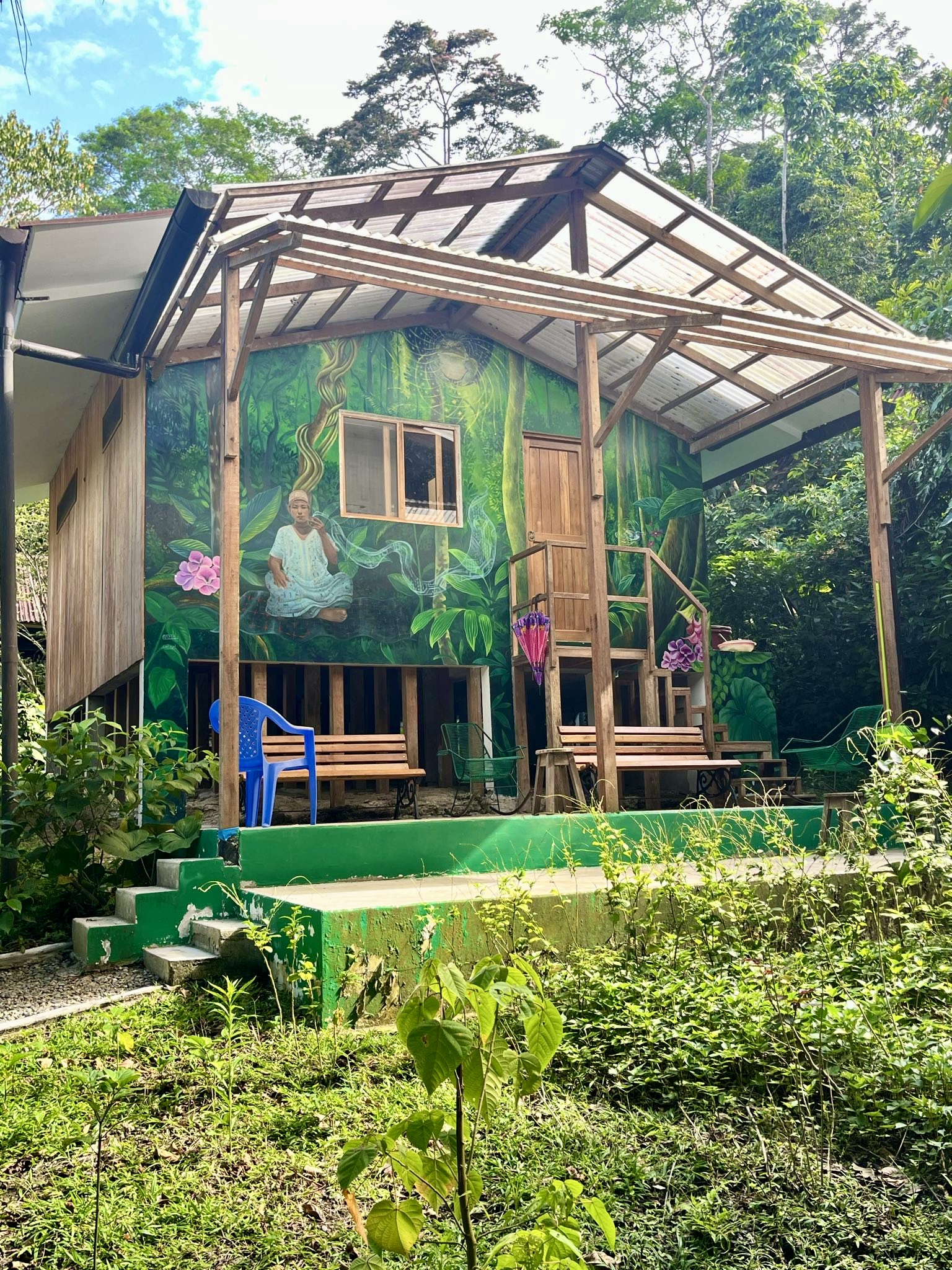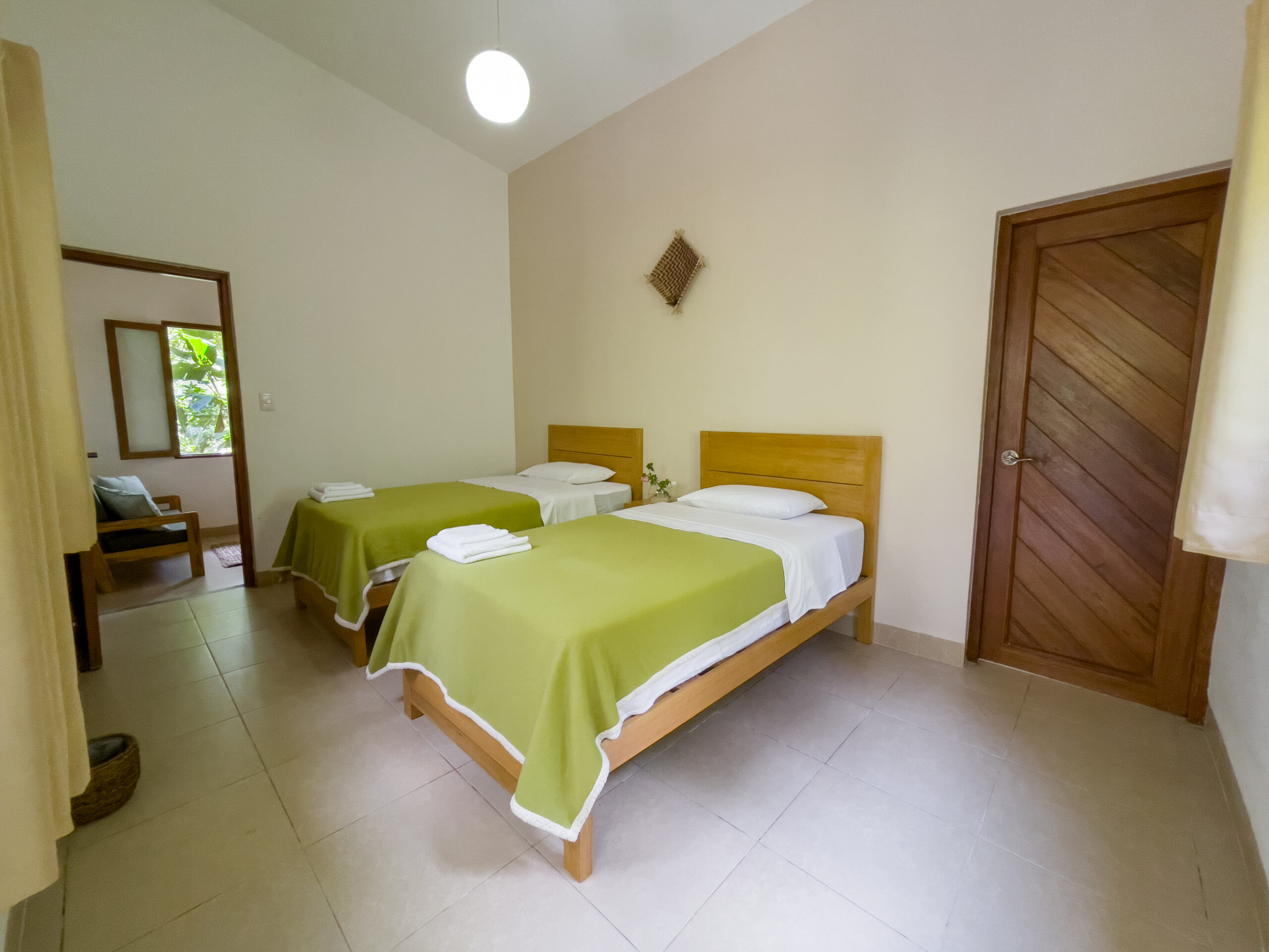 A single occupancy room in Casa Vista, potentially our most beautiful accommodation due to its location, perched up high on a hill with a view of the jungle. Room seven has a terrace with a hammock and a chair, a private bathroom with a hot shower, and a shared living room with a kitchen with room six. The bed is twin size. There is a private library in the living room. It is a very private location with the least noise pollution caused by humans. Since it is located on the hill, there are quite a few stairs one needs to climb to get to the house. It is not recommended for guests with mobility issues.