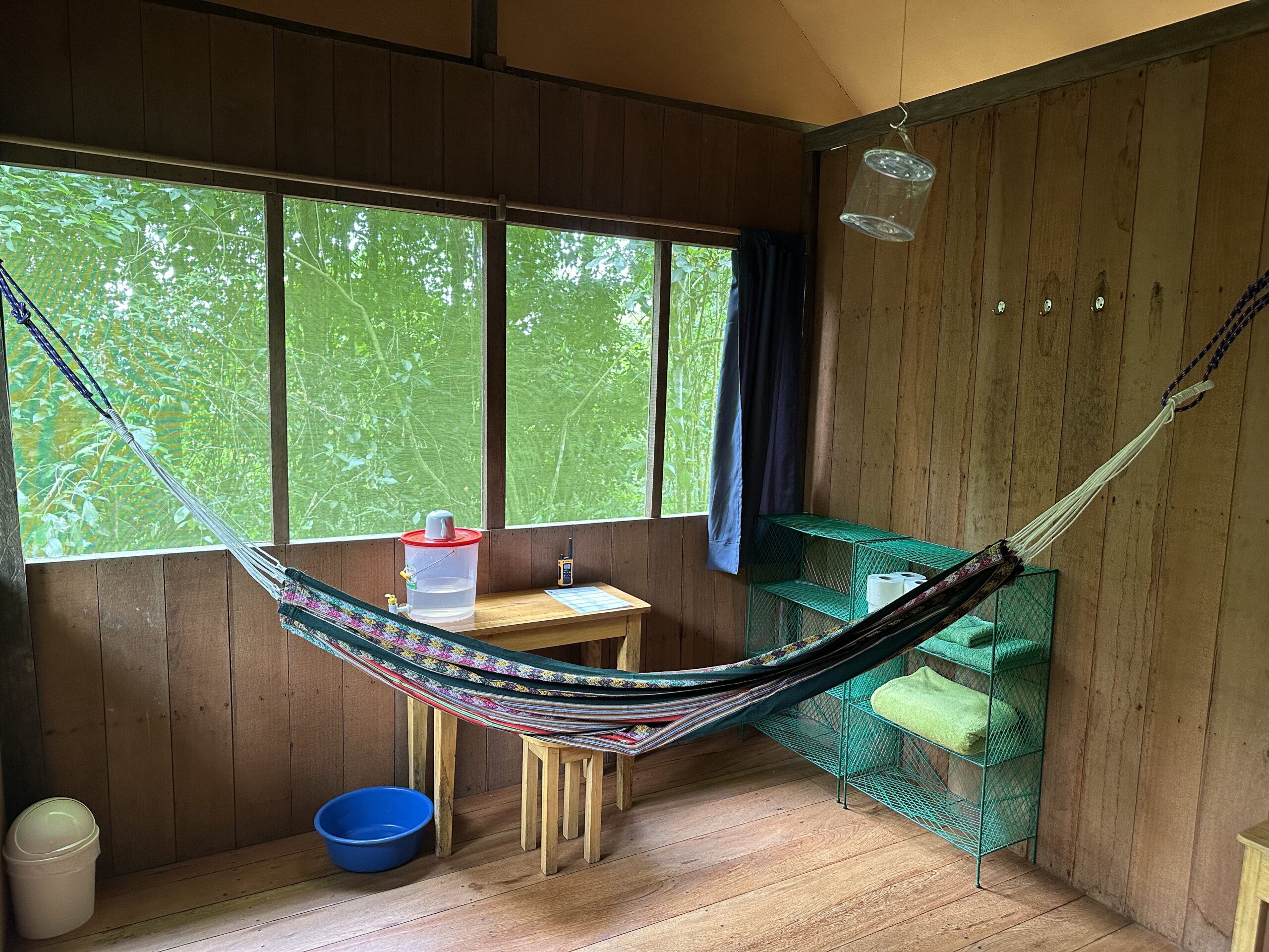 Located in the Casa Huespedes, single occupancy, private bath, hot shower, porch with chair and hammock, shared living room. Centrally located, very close to dining, chiloka, and fire pit area.