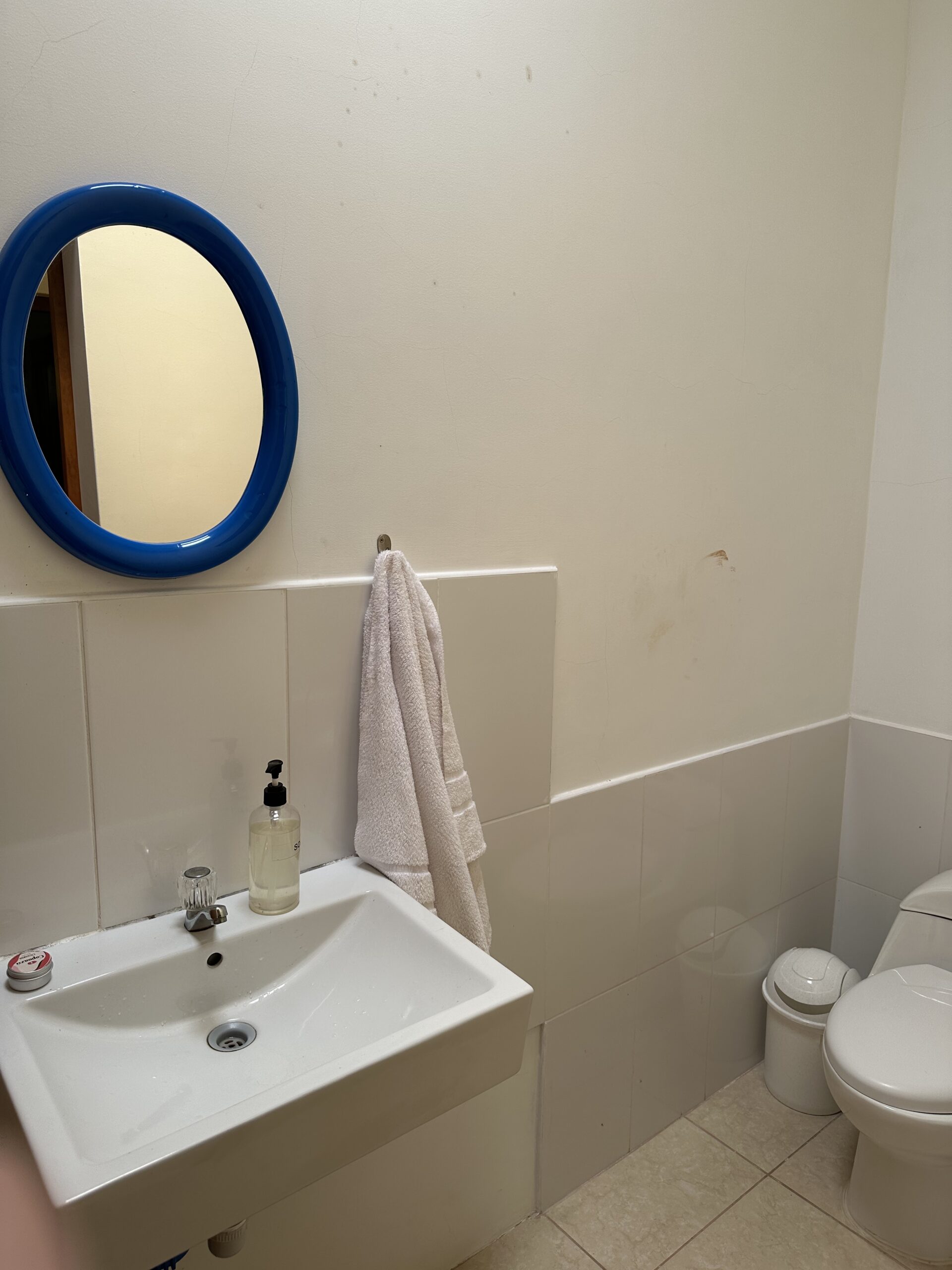 A double shared room in Casa Huespedes, which has a private toilet and hot shower for two people. It also has a private porch/terrace with a rocking chair and hammock. The house has three rooms, including a shared living room. The house is centrally located, close to dining, a chiloka, and the fire pit area.
